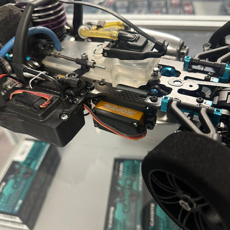Ausgestattet ist das Fahrzeug mit einem leistungsstarken Mephisto .21 Nitro Motor, der für kraftvolle Beschleunigung und zuverlässige Leistung im Renn- und Trainingsbetrieb sorgt. Für die Steuerung sind zwei Savox Servos verbaut (Lenkung sowie Gas/Bremse), die für ihre hohe Stellkraft und präzise Rückmeldung geschätzt werden.