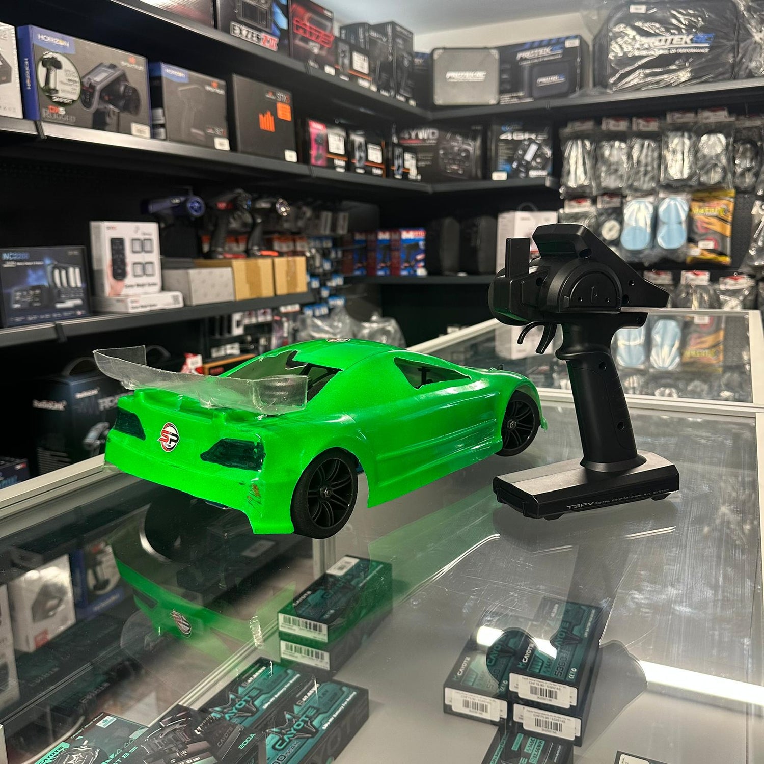 Die Kontrolle erfolgt über eine Futaba T3PV 2.4GHz Fernsteuerung, eine bewährte und zuverlässige Funke mit schneller Reaktionszeit und guter Reichweite.