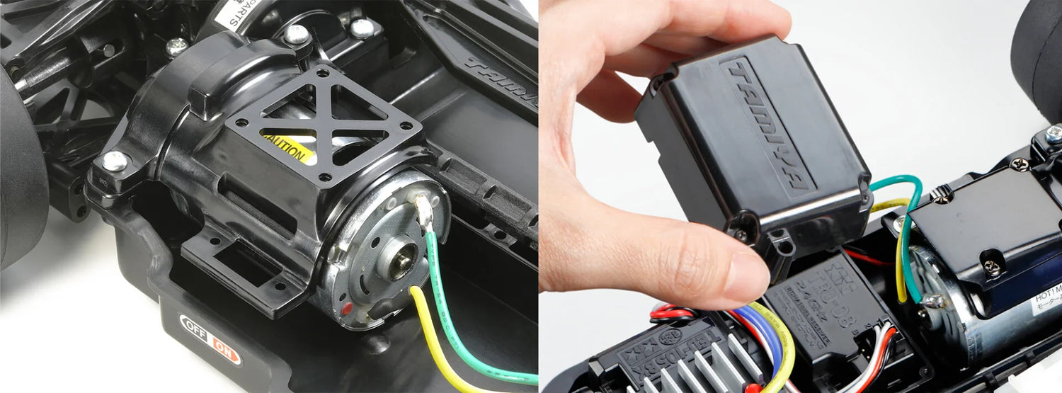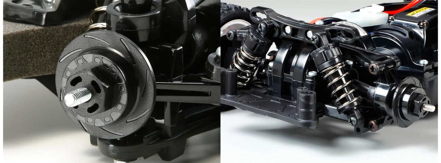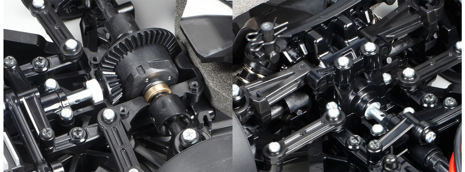 Das wellengetriebene 4WD-Chassis des TT-02 ist in Längsrichtung angeordnet, wobei sich die Batterie auf der linken und der Motor auf der rechten Seite befinden, um eine ausgezeichnete Stabilität zu gewährleisten. Darüber hinaus verfügt es über identische linke und rechte Aufhängungsarme und Achsschenkel, was die Montage erleichtert, sowie über leicht zu wartende Getriebe. Es ist ein äußerst anpassungsfähiges Fahrgestell, denn es bietet 2 verschiedene Radstände, 2 Bodenfreiheitsstufen und 2 Profilabstimmungen sowie 10 mögliche Getriebeübersetzungen. Auch die Optik kommt nicht zu kurz, denn es verfügt über Radnaben in Form von Bremsscheiben und stilvolle Stoßstangenhalterungen vorne.