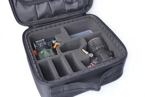 Im Inneren sorgt ein speziell geformter EVA-Hartschaum für sicheren Halt von bis zu zwei 1:8 Motoren, zusätzlich ist Platz für eine Teilebox vorgesehen. Mehrere weitere Fächer bieten Stauraum für Glühkerzen, Ersatzteile, Elektronik, Kleinteile und Zubehör. Ergänzt wird das Ordnungssystem durch mehrere Werkzeugschlitze sowie eine Reißverschlusstasche für flache Teile oder Dokumente.
